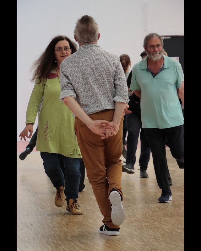 Formation en quadrettes dispersées, en pas marché avec changement de couple à chaque reprise de la danse.