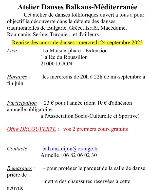 - de 20h à 22h à la Maison Phare (1 allée du Roussillon à Dijon) Atelier danses Balkans-Méditerranée avec Armelle (reprise le 24/09/25)